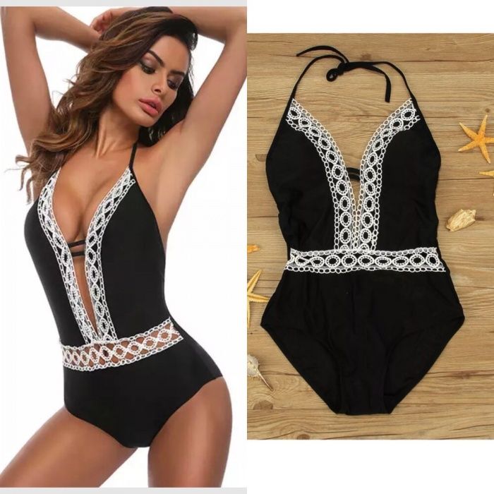 Costum De Baie Intreg Negru 2019 Dantela Alba Push Up Stil